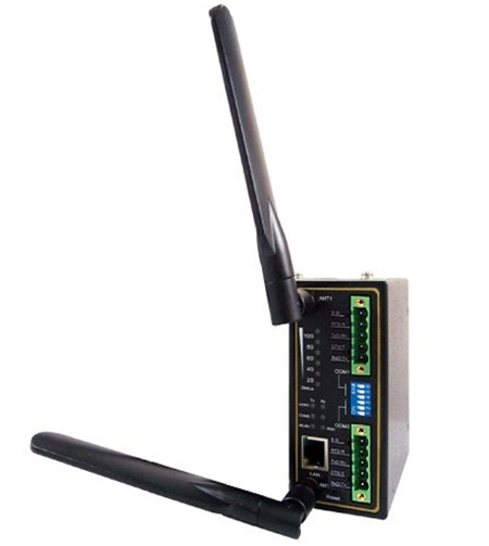 Mencom E45WSS-2TB5-IS industrial wireless serial device server has two RS-422/485 terminal blocks, one 10/100/1000 RJ45 port, and 2KV isolation with two antennas.