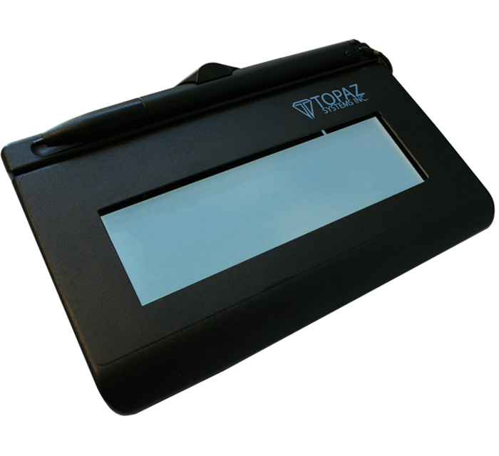 The Topaz SignatureGem LCD 1x5, model T-LBK462-HSX-R (High-Performance USB) is Topaz's smallest, rugged, advanced electronic signature capture pad with the added feature of an LCD interactive display, allowing users to see "electronic ink" under the pen tip as they sign as well as navigate and display text and graphics.