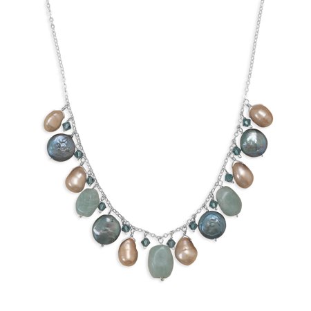 This 16-inch necklace with a 1.5-inch extension has a mix of amazonite, gray coin and golden potato cultured freshwater pearls along with crystal accents in between each element. A refreshing mix of colors on a sterling silver chain. Amazonite is 16mm x 11mm, coin pearls are 12mm, round pearls are 9mm and crystals are 4mm. .925 sterling silver. Made in the USA.