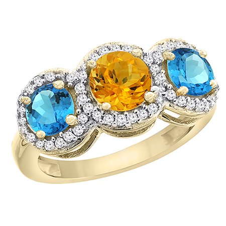 10K Yellow Gold Natural Citrine & Swiss Blue Topaz Sides Round 3-stone Ring Diamond Accents, sizes 5 - 10