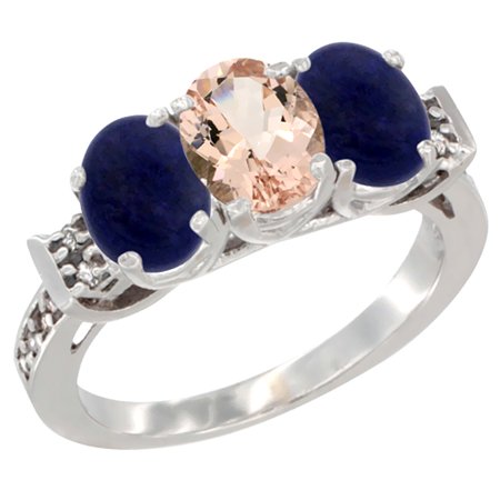 14K White Gold Natural Morganite & Lapis Ring 3-Stone 7x5 mm Oval Diamond Accent, sizes 5 - 10