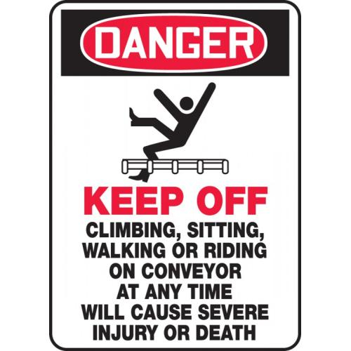 DANGER KEEP OFF CLIMBING, SITTING, WALKING OR RIDING ON CONVEYOR AT ANY TIME WILL CAUSE SEVERE INJURY OR DEATH 14" x 10" Plastic Sign