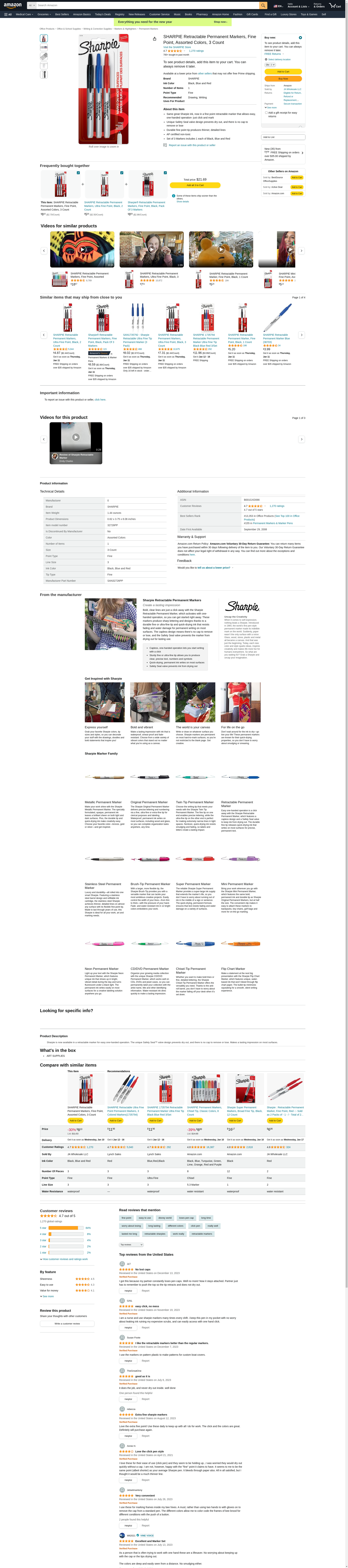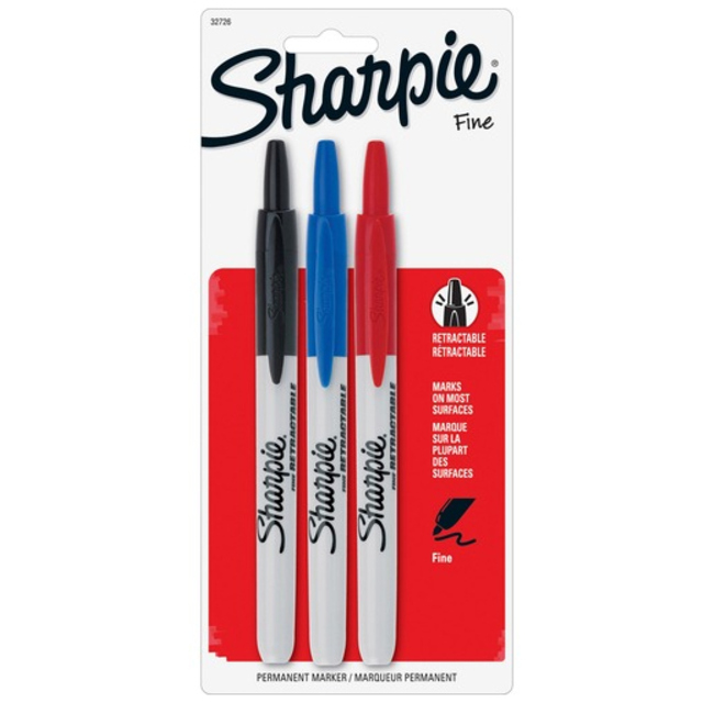 Sharpie Retractable Permanent Markers feature durable tips and quick-drying permanent inks for precise writing on most hard-to-mark surfaces. The permanent ink is water- and smear-resistant. A unique safety seal valve prevents the tip from drying out. Marker Type: Permanent; Assortment: Black; Blue; Red; Color(s): Assorted; Tip Type: Fine.