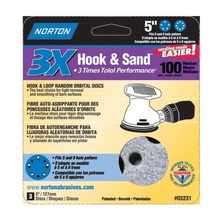 Norton Hook & Sand Hoop and Loop Disc, Paper Backing, Hook and Loop, Ceramic Alumina, 5 Hole Count, 5 inches Diameter, P100 Grit Size (Pack of 3)