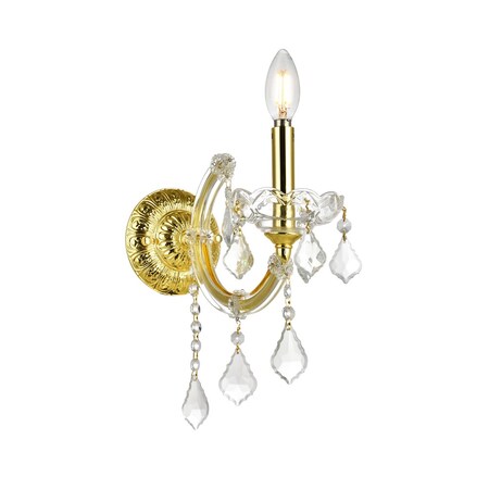 This 1 light Wall Sconce from the Maria Theresa collection by Elegant Lighting will enhance your home with a perfect mix of form and function. The features include a Gold finish applied by experts. This item qualifies for free shipping! Check the right-hand bar or call our dedicated Sales Team for similar items and additional options not pictured.