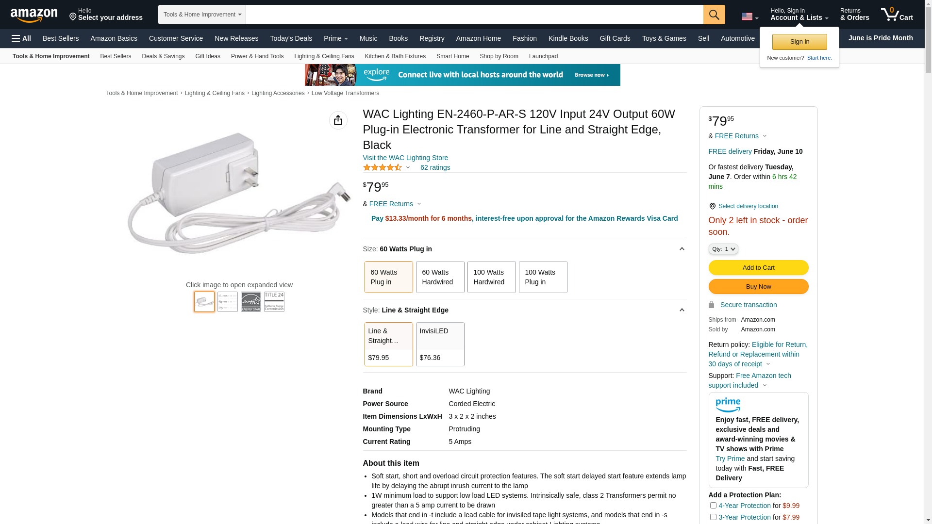 This transformer is a class 2 plug-in electronic transformer specifically designed forLINE™ under cabinet strip lights. Features: Plug-in installation 72" cord included (5) SL-WC-1 plastic wire clips included Dimmable 5 year WAC product warranty Specifications: Transformer Input: 120 volts Transformer Output: 24 volts Minimum Load: 1 watt Maximum Load: 60 watts Height: 1.75" Length:2.75" Width: 1.625" UL Listed: Yes UL Rating: Dry Location