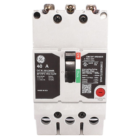 TEYL3040B THERMAL MAGNETIC, MOLDED CASE TYPE; 3 INCH W X 3 1/16 INCH D X 5 1/4 INCH H SIZE; 277 V MAX. AC VOLTAGE RATING; 250 V MAX. DC VOLTAGE RATING; 120/240 VAC, 480 VAC STAR/277 VAC, 125/250 VDC VOLTAGE RATING; 100 KILOAMPERE AT 120/240 VAC, 65 KILOAMPERE AT 480 VAC STAR/277 VAC, 42 KILOAMPERE AT 125 VDC, 35 KILOAMPERE AT 250 VDC INTERRUPTING RATING; 40 AMPERE CURRENT RATING; 3 POLE(S); LOAD LUG TERMINAL TYPE; WIRE SIZE 10 TO 4 AWG; TEYL MODEL