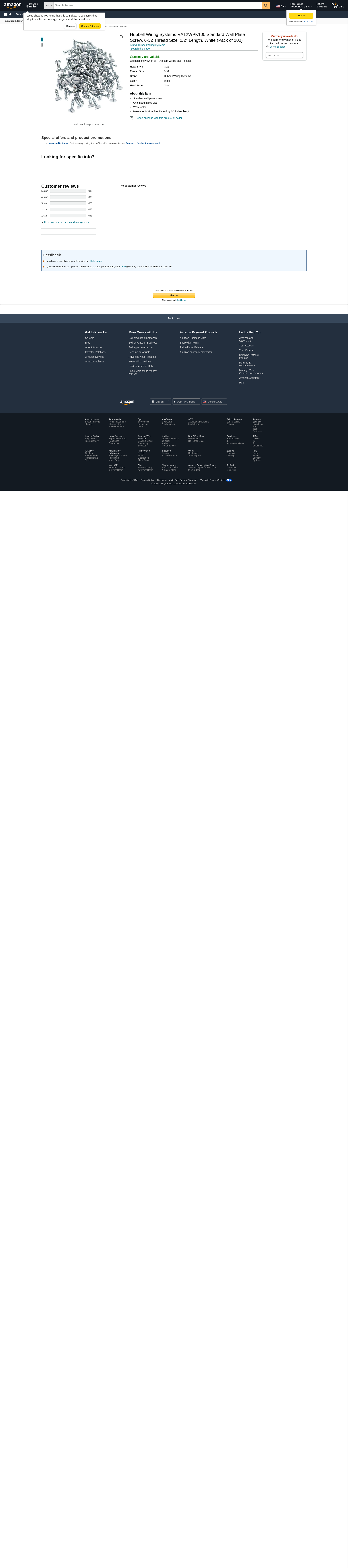Hubbell Wiring Systems RA12WPK100 Standard Wall Plate Screw, 6-32 Thread Size, 1/2" Length, White (Pack of 100)