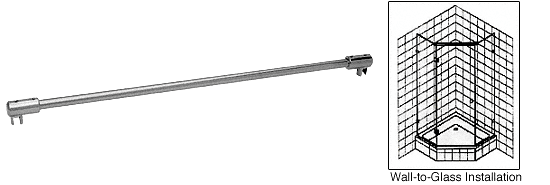 C.R. LAURENCE SUP20CH51 CRL Chrome 51" Frameless Shower Door Fixed Panel Glass-To-Glass Support Bar for 3/8" to 1/2" Thick Glass. This CRL Fixed Panel Support Bar will stabilize fixed panels of glass in enclosures that do not go all the way up to the ceiling. The Wall-To-Glass Bar has a bell-shaped clamping device on the wall side, and a solid brass end cap with a swiveling U-shaped receptacle to secure the fixed panel. The Glass-to-Glass Bar has a solid brass end cap with a swiveling U-shaped receptacle on both sides to secure each fixed panel. Nylon-tipped set screws secure the glass and prevent glass-to-metal contact. No holes or cut-outs required. Stock Bars are 51" (1275 mm) in length. Simply cut to size required..