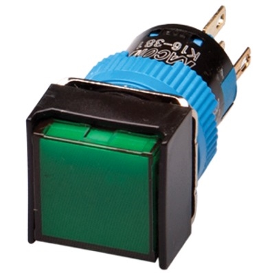 Kacon K16-180-G-6V 16 mm pilot lamp has a square, green lens. Illuminated by 6VDC LED. Rated IP 65
