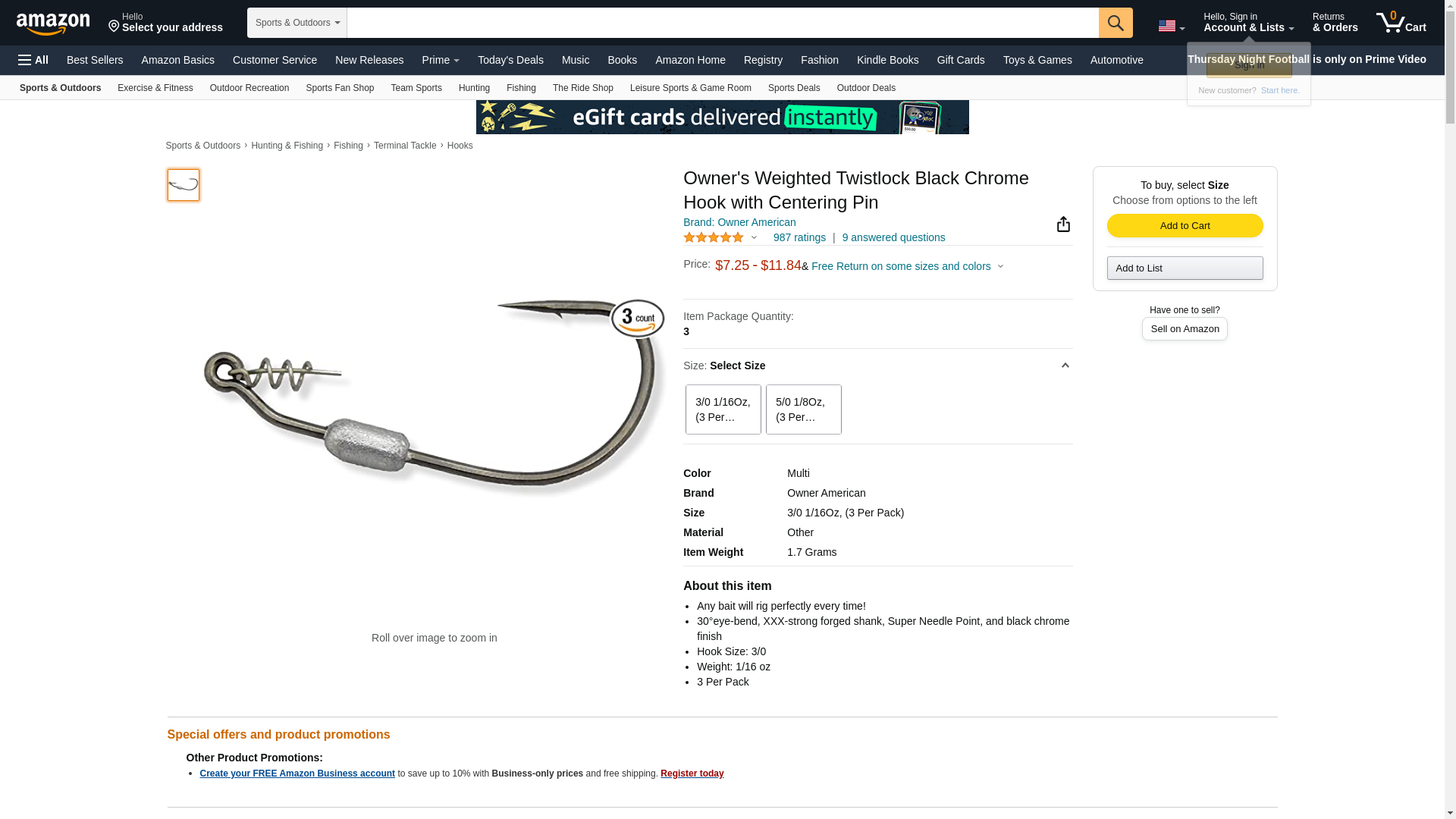 Owner American Weighted Twistlock Black Chrome Hook With Centering Pin (Size 4/0, 1/8Oz, 3 Per Pack)