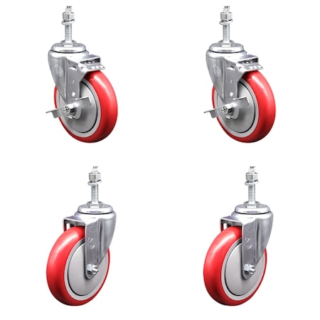 5 Inch SS Red Polyurethane Swivel 3/8 Inch Threaded Stem Caster Brakes, 2PK