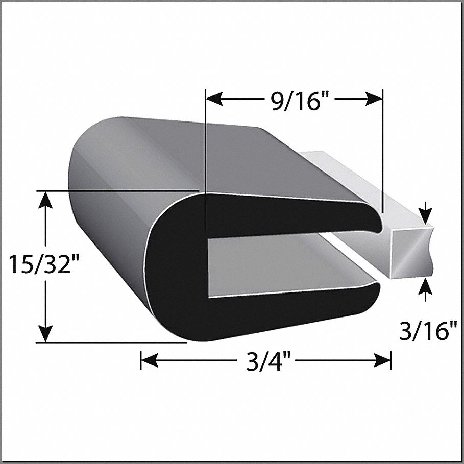Rubber Edging, Application Automotive, For Material Thickness 3/16 in, Hardness 70A, Inside Height 3/16 in, Inside Radius 2 in, Inside Width 9/16 in, Material Neoprene, Maximum Operating Temperature 212 Degrees F, Minimum Operating Temperature -40 Degrees F, Overall Height 15/32 in, Overall Length 100 ft, Overall Width 3/4 in, Resistance Properties Compression Set, Ozone Resistant, Sunlight Aging Resistant, Temperature Resistant, Water Resistant, Standards RoHS Compliant