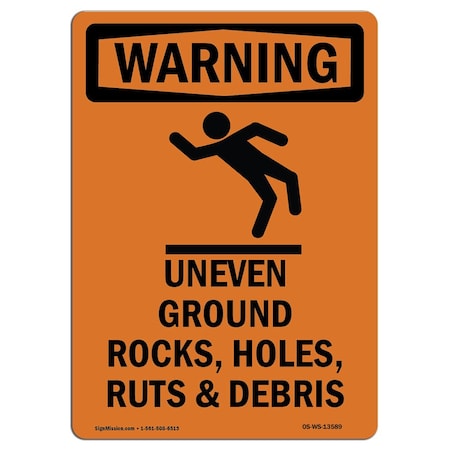 OSHA WARNING Sign, Uneven Ground Rocks W/ Symbol, 24in X 18in Decal