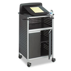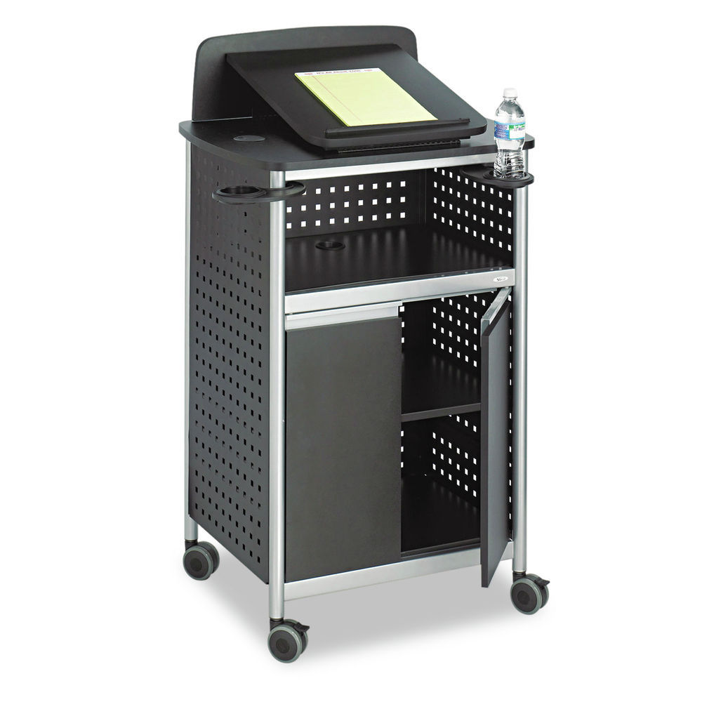 Safco Scoot℠This multipurpose lectern travels easily and adapts to a variety of situations. Fold-down platform offers a flat surface for media needs. Open shelf beneath presentation surface plus large enclosed storage area with adjustable shelf help keep materials close at hand. Two swivel cup holders. Powder-coated steel construction with durable laminate shelves. Four easy-rolling casters for mobility and two locks for added stability.