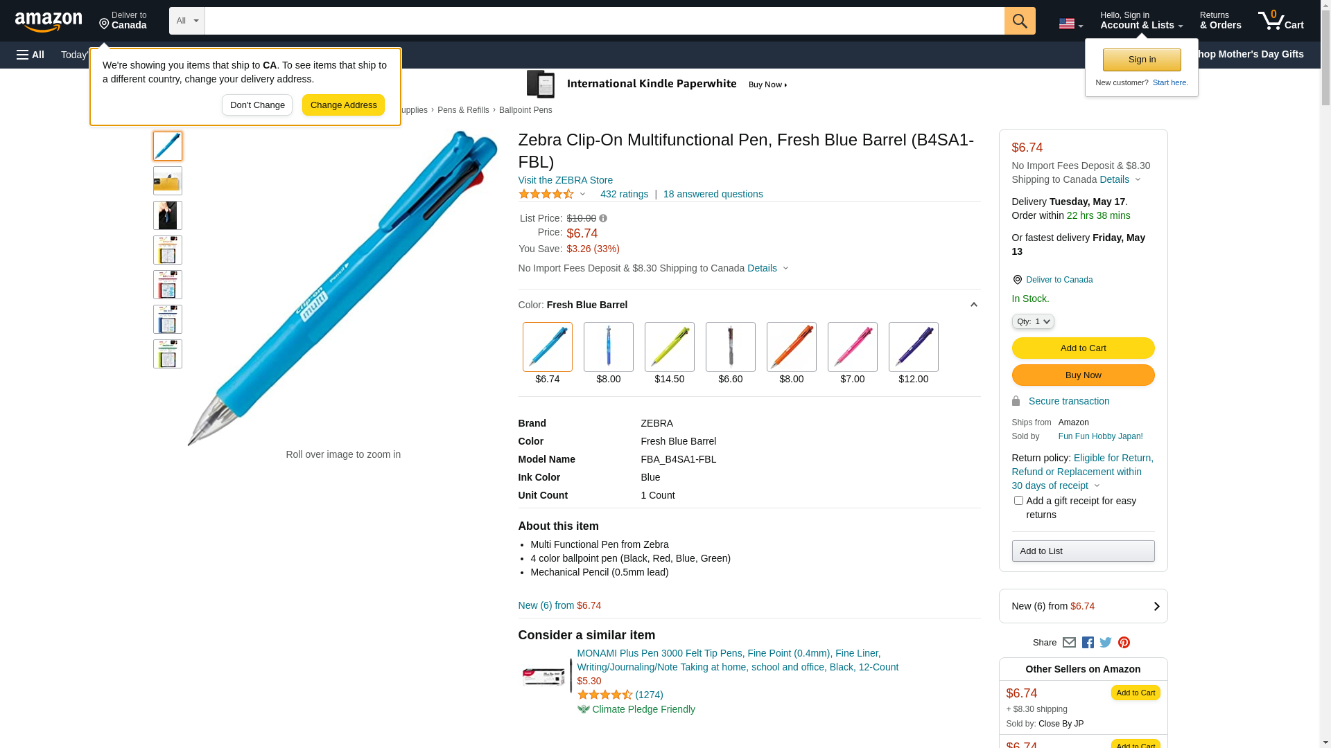 Zebra Clip-On Multifunctional Pen, Fresh Blue Barrel (B4SA1-FBL). Multi Functional Pen from Zebra. 4 color ballpoint ...