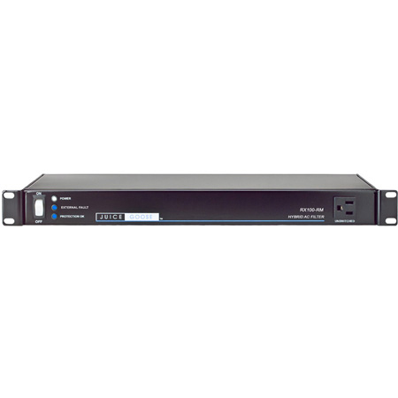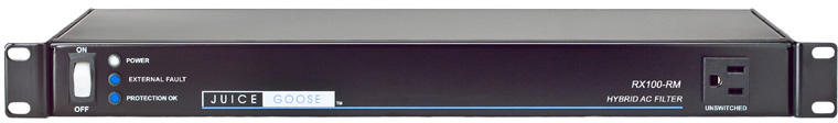 The Juice Goose <b>RX100-RM</b> provides ultra clean power and protection against AC line surges and spikes as well as in-wall wiring faults. Hybrid Filter Technology reduces high frequency noise and high energy surges both on normal (line - neutral) and common (neutral - ground) mode paths.</p><p>Compare the RX Series performance to any other power conditioning device. Compare our high levels of line noise filtration and extremely low surge let through levels. In particular, compare performance on hot, neutral and ground paths. Now compare our price.</p><p>The Hybrid Filter design in the RX100-RM includes a differential transformer, lots of filtering capacitance and control circuitry providing protection from dangerous surges, high frequency interference, building wiring faults and over voltage. RX technology delivers performance enhancement and protection comparable to an isolation transformer - but at a fraction of the price and in a fraction of the space.</p><p>This Juice Goose power protection technology is particularly valuable because it works against common mode as well as normal mode events. While common mode surges and disturbances don't typically cause catastrophic damage, they can result in operating failures and improper performance of digital processing equipment.</p><p>Compared with the low operating voltage of processor logic, a power anomaly of even 1 or 2 volts on data lines or logic ground can cause problems. That's why the RX100-RM is designed to have a voltage surge let through of only 1/2 volt between neutral and ground.</p><p>The Hybrid Filter also protects against more dramatic events. Connected equipment is safe from surges up to 6,000 volts at 3,000 amps on hot, neutral and ground.</p><p>The sturdy, Tour Class™ chassis of the Juice Goose RX100-RM is built for an exceptionally long service life. It features a "unibody" construction - with the front, bottom and back formed from a single piece of magnetic shielding, cold rolled steel. The reinforced mounting brackets are attached to the chassis in eight places. </p><p>Eight AC outlets provide ample connection opportunity, including unswitched outlets on the front and back of the chassis. The twelve foot power cord enables use at a greater distance from power sources.</p><p>Compare all the advantages of the Juice Goose Hybrid Filter Technology: performance, features and price. The RX100-RM does a lot more for a lot less.</p><p><b>Please Note</b>: The RX100-RM is designed to operate with 120VAC, 60 Hz. Operation with 220 or 240 volts will damage the unit and possibly cause personal injury</p><p><b>Made in America</b></p>
