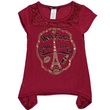 A metallic graphic and lace yoke add distinction to this Miss Majesty top. <ul> <li>Miss Majesty top</li> <li>Stretch rayon construction (95% rayon, 5% spandex)</li> <li>Lace yoke (90% nylon, 10% spandex)</li> <li>Metallic chest graphic</li> <li>Sharkbite hem</li> <li>Machine wash cold, gentle, inside out</li> <li>Made in USA</li> </ul>