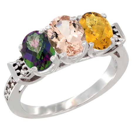 10K White Gold Natural Mystic Topaz, Morganite & Whisky Quartz Ring 3-Stone Oval 7x5 mm Diamond Accent, sizes 5 - 10