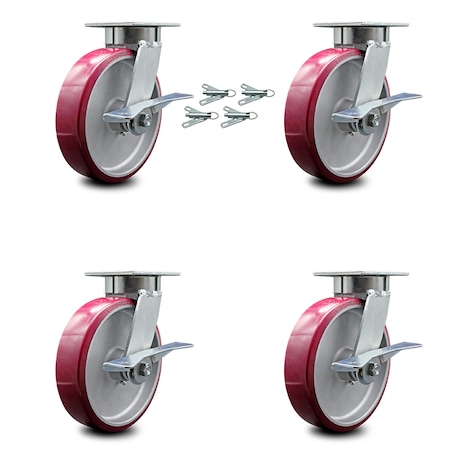 Kingpinless Polyurethane on Aluminum Swivel Top Plate Caster Set of 4 w/8" x 2" Maroon Wheels - Includes 4 Swivel w/Side Lck Brakes & Bolt on Swivel Locks-5000lbs Total Capacity - Service Caster Brand