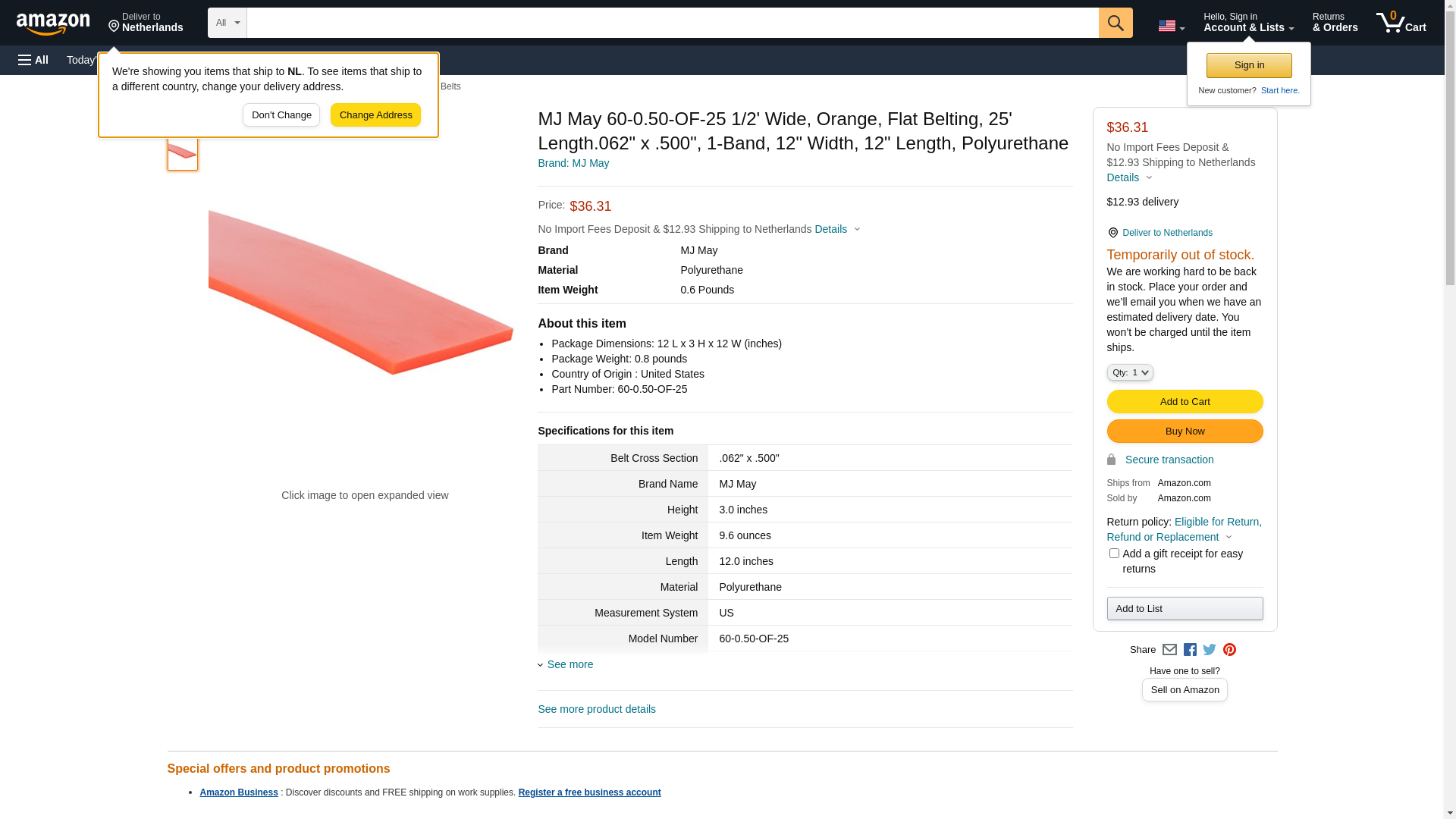 MJ May 60-0.50-OF-25 1/2' Wide, Orange, Flat Belting, 25' Length, 062" x .500", 1-Band, 12" Width, 12" Length, Polyurethane