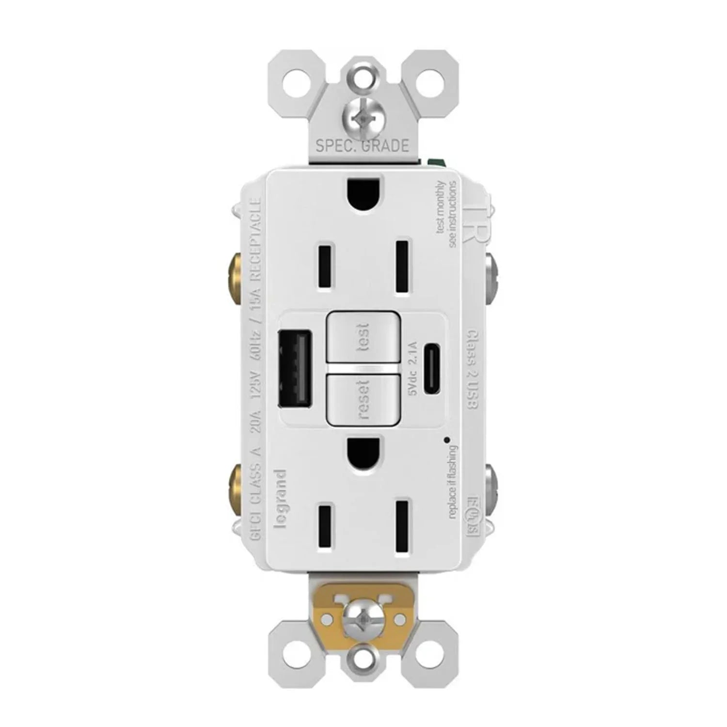 - Included - 1 Legrand - Pass & Seymour Radiant white gfci outlet, tamper-resistant 15 amp GFCI electrical outlet with USB ports built-in for fast and easy charging ports for USB A/C