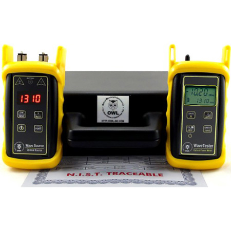 Many fiber optic network bids and Requests For Quote RFQ are citing cabling standards to specify the set of guidelines such as fiber length that the network installer must follow during the network installation Adherence to such standards is meant to ensure the quality of the installation and guarantee that the network will perform as it was designed The process of testing a network installation to ensure its adherence to specified standards is called certification and often requires hardcopy documentation as proof of adherence to standardsThe Fiber OWL 4 BOLT Quad Test Kit contains the tools necessary for certifying fiber optic links against a myriad of popular cabling standards in singlemode and multimode networksThe WaveTester WaveSource Quad Test Kit contains the tools necessary for certifying fiber optic links against a myriad of popular cabling standards in multimode and singlemode networksTheWaveTester optical power meteris multimode and singlemode ready and can store reference values for all wavelengths used for optical loss measurements Up to 200 fiber runs may be stored and serially downloaded to a PC for report generation using our OWL Reporter softwareThe WaveSource Quad is a combined multimode singlemode light source Its quadwavelength outputs 850 1300nm for multimode and 1310 1550 nm for singlemode are temperaturestabilized for accurate measurements Features. Certification of multimode fiber links at 8501300nm and singlemode fiber links at 13101550nm. Autotest functions store references and data points automatically. Data storage for up to 200 data points. USB interface for continuous data logging report printing or data downloading. OWL Reporter software for printing formatted fiber certification reports. Measurement modes include absolute or relative. Selectively view delete or resample data pointsSpecifications. Detector Type InGaAs. NIST Traceable Wavelengths 850nm 1300 1310nm 1550nm. Optical Power Measurement Range 5 to 60 dBm. Battery Life up