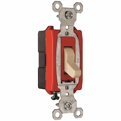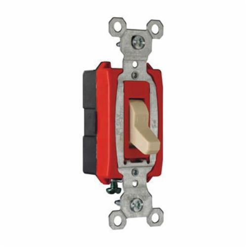 TOGGLE TYPE; GLASS REINFORCED NYLON (BACK BODY), NYLON (FRONT BODY), THERMOPLASTIC POLYCARBONATE (TOGGLE) MATERIAL; 1.32 INCH WIDTH X 1.073 INCH DEPTH SIZE; IVORY COLOR; 1-POLE OPERATION TYPE; UL 498/20, UL (CANADA AND US), CSA C22.2, FSUL WS896 APPROVAL; COMMERCIAL, RETAIL, OFFICE, HOSPITALITY/LODGING, MULTIPLE DWELLING APPLICATION; 120/277 VOLT AC VOLTAGE RATING; 20 AMP CURRENT RATING; 1 HP AT 120 VOLT AC, 2 HP AT 240 VOLT AC POWER RATING; SIDE WIRING; NO WALL PLATE INCLUDED; GRADE SPECIFICATION; WIRE SIZE 14 TO 10 AWG COPPER; TEMPERATURE RATING -40 TO 115 DEG C; FLAMMABILITY RATING UL 94 V-2; INCLUDES BRASS TERMINAL/SPRING ARM, BRASS PLATED STEEL TERMINAL SCREW, PLATED STEEL STRAP, SILVER CADMIUM OXIDE CONTACT, RUBBER BUMPER, ZINC PLATED STEEL SPRING; APPLICABLE STANDARD NEMA WD-1/WD-6; CS20AC1 MODEL