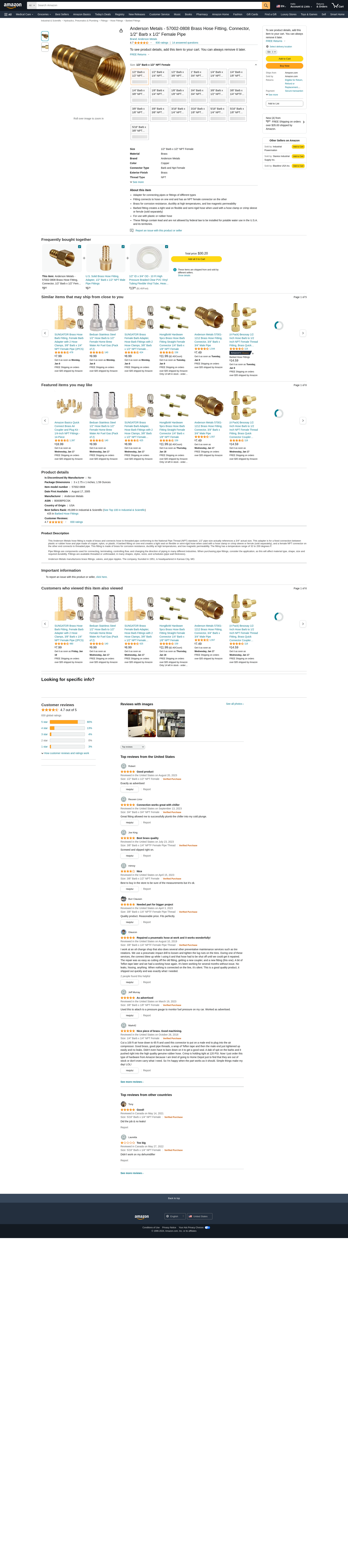 Anderson Metals - 57002-0808 Brass Hose Fitting, Connector, 1/2" Barb x 1/2" Female Pipe