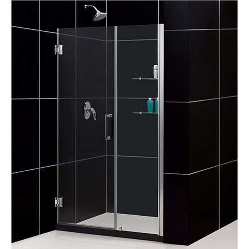 DreamLine Unidoor 47 to 48" Frameless Hinged Shower Door, Clear 3/8" Glass Door, 24" Stationary Panel w/ Shelves, Chrome Finish Hardware