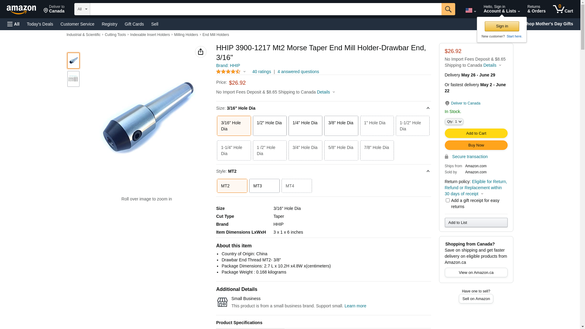 Hhip Mt2 Morse Taper End Mill Holder 3-16" 3900-1217 ZO-G2452985 - SIM Supply