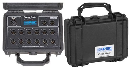 The Professional Sound Corporationr Press Train is a compact and easy to use in the field. It serves as a one input, 12 output passive audio distribution box designed to feed high quality audio for press conferences. This ruggedly built device is housed in a waterproof Pelican 1120 case for ease of use and shipping. The PSC Press train can be used in conjunction with our PSC Press Bridge or with any professional balanced line level source. Its input accepts a standard +4dBm balanced line level signal and provides 12 transformer isolated microphone level outputs. Our custom wound, mu-metal-shielded transformer's high input impedance insure that up to 8 PSC Press Trains can be connected to any professional 600 ohm balanced line without excessive line loading or distortion. Thus, you can obtain 96 separate, transformer-isolated, microphone-level outputs from a single line level source. Up to 300 outputs can be created with a PSC Press Bridge and 24 PSC Press Trains.</p><p>The PSC Press Train has one line level input and two line level loop-through connectors that are used to feed additional Press Trains. Up to 8 PSC Press Trains may be connected in any daisy chain configuration without loss of sound quality. Interconnection of additional PSC Press Trains is accomplished with standard microphone cables. Each of the Press Trains' 12 isolated microphone level outputs have isolated grounds to eliminate ground loops.</p>