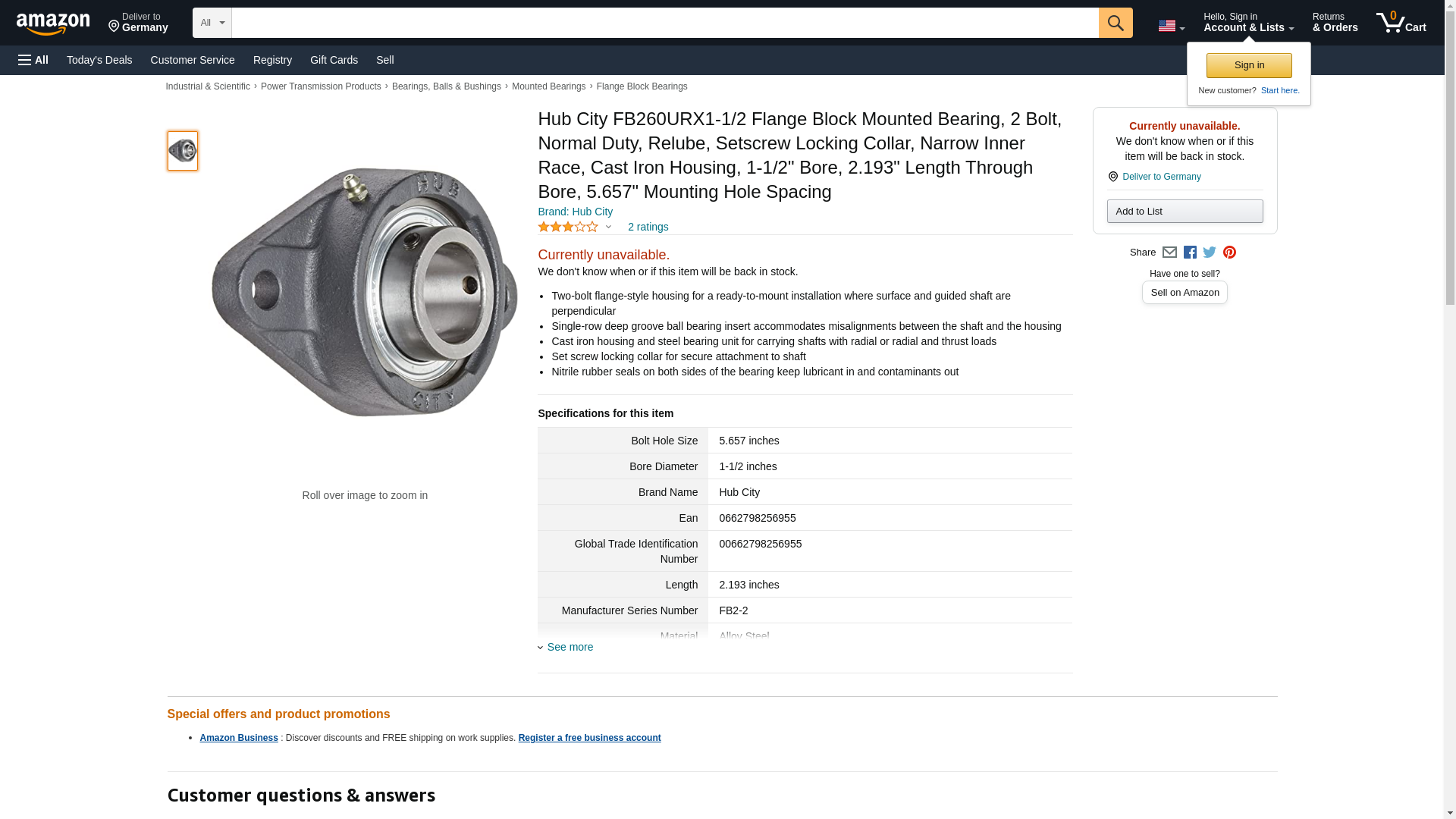 Hub City FB260URX1-1/2 Flange Block Mounted Bearing, 2 Bolt, Normal Duty, Relube, Setscrew Locking Collar, Narrow Inner Race, Cast Iron Housing, 1-1/2" Bore, 2.193" Length Through Bore, 5.657" Mounting Hole Spacing