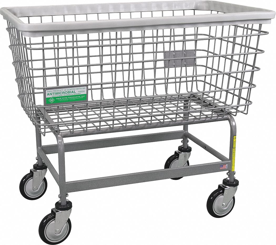 Antimicrobial Wire Cart, Number of Compartments 1, Gray, Cubic Foot Capacity 7.5 cu ft, Load Capacity 600 lb, Laundry Container Material Steel Wire, Laundry Cart Frame Material Steel, Caster Configuration (4) Swivel, Caster Dia. 5 in, Overall Length 36 1/2 in, Overall Width 23 in, Overall Height 32 1/2 in