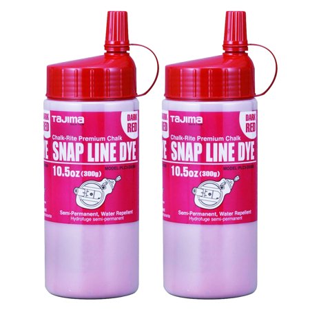 Tajima PLC3-DR300 Snap-Line Dye Chalk, Semi-Permanent - Dark Red, 10.5 oz (300 g). Wind resistant, water repellent, extra-strong chalk for long lasting marking lines. Fade resistant, makes a sharp and extremely bold marking line. Formulated to prevent caking and clumping on the line. Available in black and dark color options. Easy-pour, moisture-proof bottles with screw-cap nozzles.
