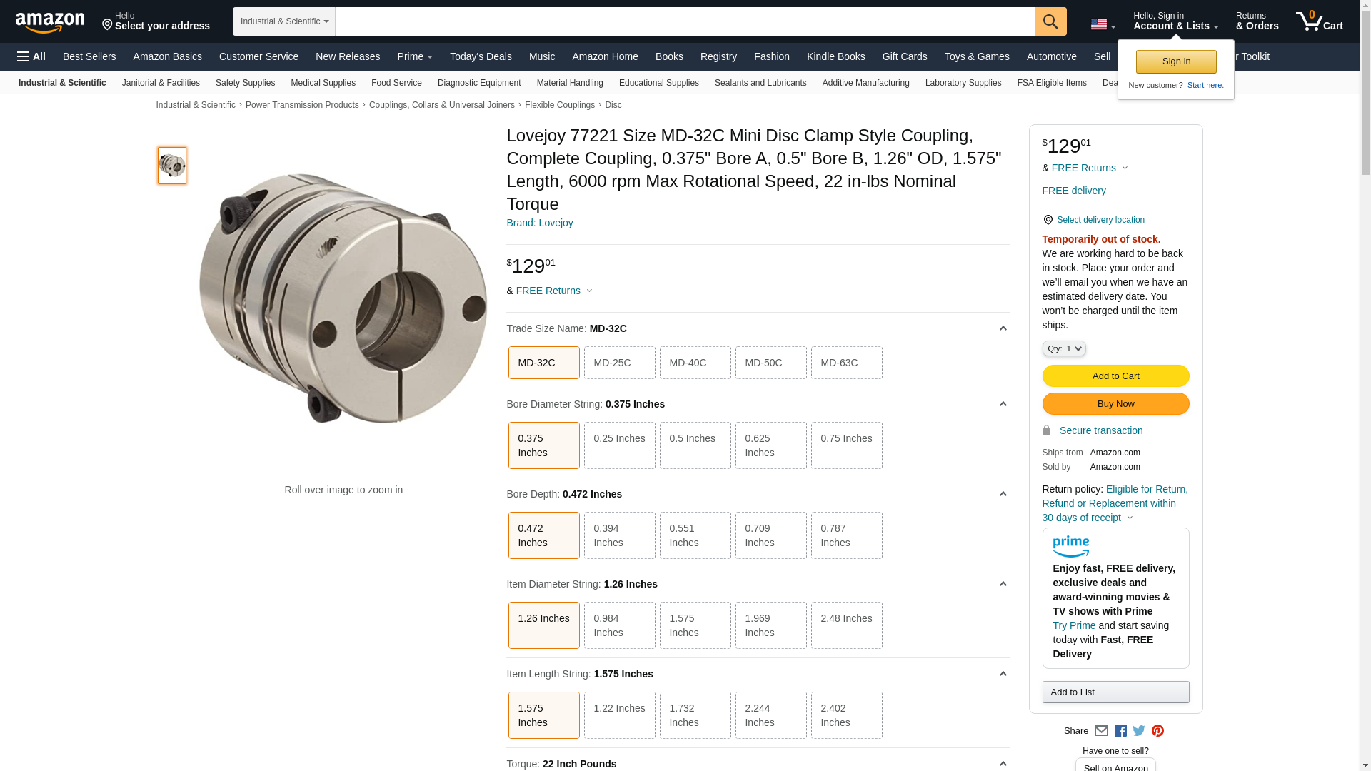 Lovejoy 77221 Size MD-32C Mini Disc Clamp Style Coupling, Complete Coupling, 0.375" Bore A, 0.5" Bore B, 1.26" OD, 1.575" Length, 6000 rpm Max Rotational Speed, 22 in-lbs Nominal Torque
