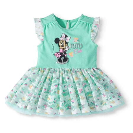 <br /> <b>Minnie Mouse Baby Girls' Flutter-Sleeve Tutu Bodysuit:</b> <ul> <li>Bodice: 60% cotton, 40% polyester </li> <li>Tulle: 100% polyester </li> <li>Girls' bodysuit </li> <li>Front graphics of Minnie Mouse </li> <li>2fer-style </li> <li>Short flutter sleeves </li> <li>Fully lined tulle skirt with all-over graphics </li> <li>Three snap-button diaper closure </li> <li>Scoop neckline </li> <li>Back key-hole button closure </li> <li>Turn garment inside out before washing, machine wash cold with like colors, gentle cycle, do not bleach, tumble dry low, remove promptly, cool iron on reverse if needed, do not iron print</li> </ul><p>Country of Origin: Imported