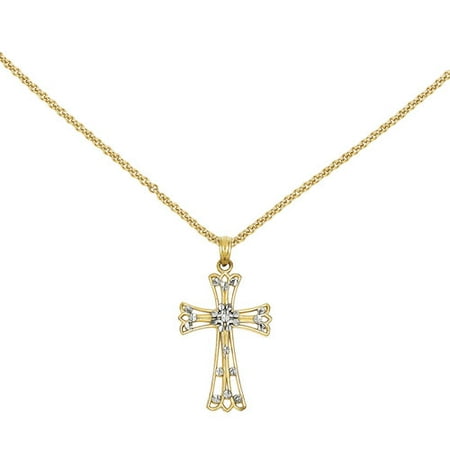 <br /> <b>14kt Yellow Gold and Rhodium Diamond-Cut Filigree Cross Pendant:</b> <ul> <li>Diamond-cut</li> <li>Polished finish</li> <li>Crafted in 14kt yellow gold and rhodium</li> <li>Textured</li> <li>Fleur De Lis</li> <li>18" chain</li> <li>Lobster claw closure</li> </ul> <p>Every piece of Walmart jewelry passes rigorous inspection at our Quality Assurance labs. So you can buy with confidence ? guaranteed. <spanclass=text2bold> <a href="http://learn.walmart.com/Beauty/Articles/Jewelry_Quality_Guarantee/20636/">Learn More</a> <br /> </spanclass=text2bold></p>