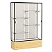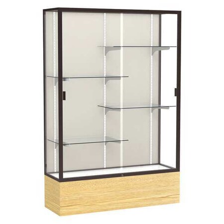2074PB-BZ-LV Backing: Plaque Fabric, Frame Finish: Dark Bronze, Vinyl Finish: Light Oak Features: -Sliding tempered glass doors for safety and easy access to contents. -Built in lock for security. -Anodized aluminum framing. -Adjustable levelers for stability on uneven floors. -Wood grain vinyl base. -Reflective mirror back adds luster and class. Product Type: -Trophy display case. Style: -Floor standing. Display Material: -Glass. Country of Manufacture: -United States. Frame Material: -Metal. Adjustable Shelves: -Yes. Dimensions: Overall Height - Top to Bottom: -72". Overall Width - Side to Side: -48". Overall Depth - Front to Back: -16". Overall Product Weight: -279 lbs.
