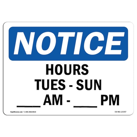 OSHA Notice Sign, Hours Tues, Sun ____ Am, ____ Pm, 10in X 7in Aluminum