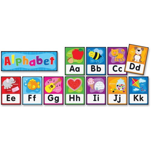 Setting up a bright, engaging display has never been easier! No need for tape, staples or push pins! Self-adhesive set sticks and resticks to any smooth surface, even painted cinderblocks. Can be reused and repositioned over and over again. Includes 26, 6 x 8 1/2, precut alphabet pieces and a header. Theme: Alphabet; Color(s): N/A; Width: N/A; Height: N/A.