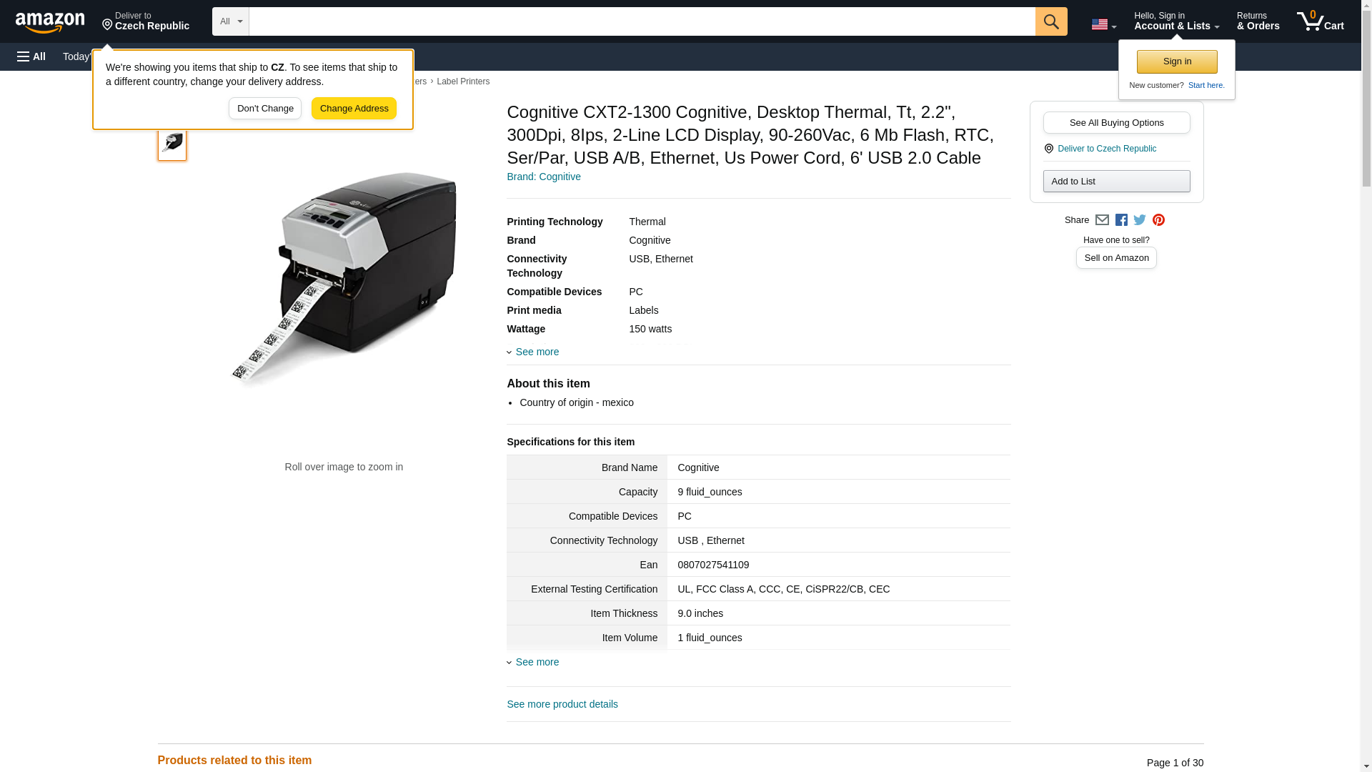 Cognitive CXT2-1300 Cognitive, Desktop Thermal, Tt, 2.2", 300Dpi, 8Ips, 2-Line LCD Display, 90-260Vac, 6 Mb Flash, RTC, Ser/Par, USB A/B, Ethernet, Us Power Cord, 6' USB 2.0 Cable