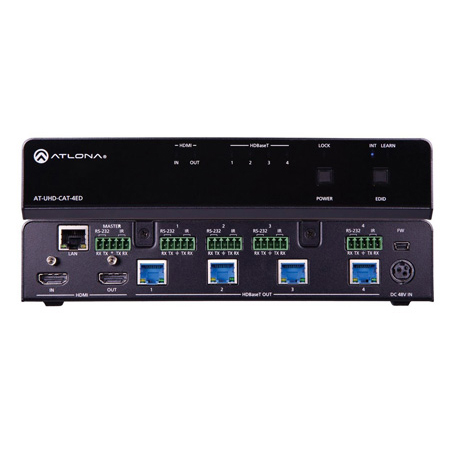 The Atlona <strong>AT-UHD-CAT-4ED</strong> distribution amplifier featuring pass-through HDMI input connections, four extended distance, Ethernet-enabled HDBaseT outputs and display control capability. Each output transmits AV and control signals up to 330 ft. (100 m). Features include 4K/UHD @ 60 Hz with 4:2:0 color subsampling, HDCP 2.2 compliance, EDID management, and PoE for powering remote receivers. A wide variety of consumer displays may be controlled by the UHD-CAT-4ED using CEC*. Designed for commercial distribution applications, the UHD-CAT-4ED is control system-friendly and integrates with any TCP/IP, RS-232, or IR control system and features a 1U, half-rack width enclosure with external, international power supply. Compatible Atlona receiver: AT-UHD-EX-100CE-RX.</p><p>Signal distribution applications increasingly require compatibility with HDCP 2.2, 4K/UHD @ 60 Hz support with 4:2:0 color subsampling to ensure images reach displays with compatible copy protection and with the pristine digital image quality of the original signal, without artifacts resulting from inferior image distribution systems. HDBaseT distribution ensures reliable, long-distance transmission of high resolution audio and video signals. These core features along with added display control provide additional flexibility. Power over Ethernet not only provides compatibility with Atlona Extender products but enables HDBaseT Certification.</p><p><strong>Applications:</strong><br /><li>Retail, restaurant, and entertainment environments that need long distance signal extension of high-impact messages and program information. (See this featured application as an example.)</li><li>TV showrooms that demand the highest quality signal be delivered to each 4K television to entice customers to make an immediate purchase decision</li><li>Any single image/multi-screen environment that requires display control</li></p>
