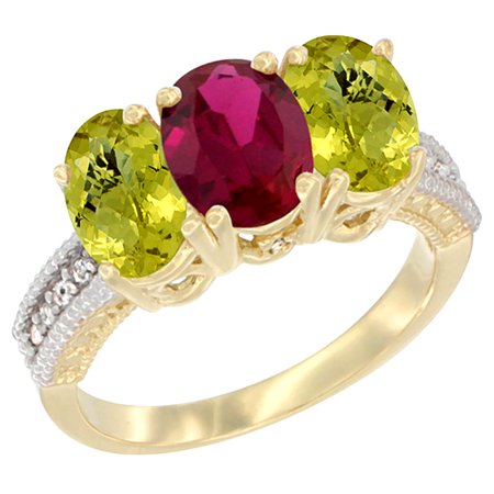 10K Yellow Gold Diamond Enhanced Ruby & Natural Lemon Quartz Ring 3-Stone 7x5 mm Oval, sizes 5 - 10
