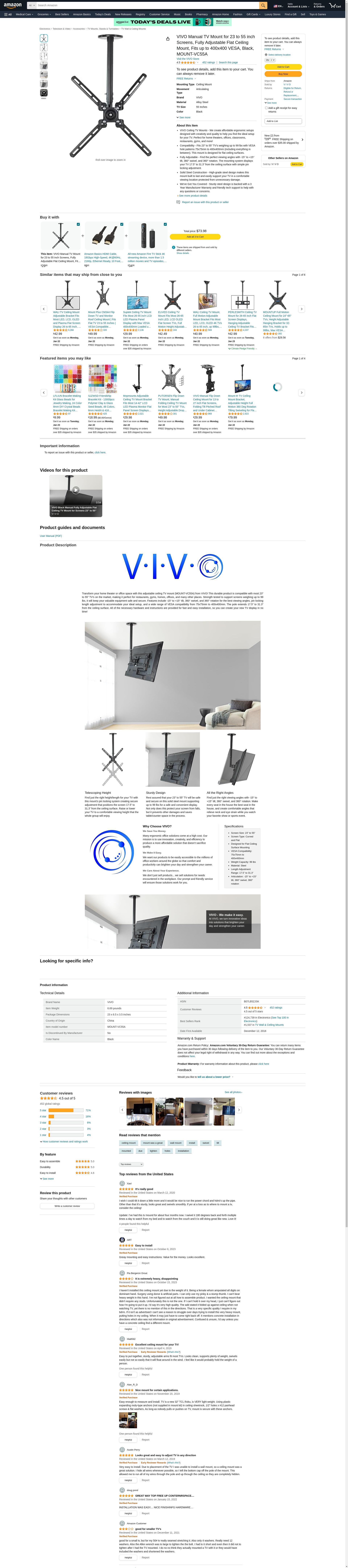Transform your home theater or office space with this adjustable ceiling TV mount (MOUNT-VC55A) from VIVO! This durable product is compatible with most 23” to 55” TV’s on the market, making it perfect for restaurants, gyms, homes, offices, and many other places. Strength tested to support screens weighing up to 99 lbs, it will keep your valuable equipment safe and secure. Features include -15° to +15° tilt, 360° swivel, and 360° rotation for the best viewing angles, pin locking length adjustment to accommodate your ideal setup, and a wide range of VESA compatibility from 75x75mm to 400x400mm. The pole extends 17.5” to 31.3” from the ceiling surface. All of the necessary hardware and instructions are provided for fast and easy installation, so you can create your new TV display in no time! <br><br> <b>Compatibility </b> <br> Screen Size: 23” to 55” <br> Screen Type: Curved and Flat <br> Ceiling Type: Designed for Flat Ceiling Surface Mounting <br> VESA Compatibility: 75x75mm to 400x400mm <br> Weight Capacity: 99 lbs <br><br> <b>Specifications </b> <br> Color: Black <br> Material: Steel <br> Surface Finish: Powder Coating <br> Length Adjustment Range: 17.5” to 31.3” <br> Articulation: -15° to +15° tilt, 360° swivel, and 360° rotation