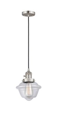 INNOVATIONS 201CSW-SN-G532-LED 1-Light Mini Pendant Brushed Satin Nickel. Collection: Franklin Restoration. Style: Traditional. Metal Finish: Brushed Satin Nickel. Metal Finish (Canopy/Backplate): Brushed Satin Nickel. Material: Steel, Cast Brass, Glass. Dimension(in): 8(H) x 7.5(W) x 7.5(Dia). Min/Max Height (Fixture Height with Cord or Included Stems & Canopy)(in): 13/131. Wire/Cord: 10 Feet Of Black Textured Cord. Bulb: (1)6W Medium Base,Dimmable(Not Included). Maximum Wattage Per Socket: 100. Voltage: 120. Color Temperature (Kelvin): 2700. CRI: 82. Lumens: 600. Glass Shade Description: Clear Small Oxford. Glass or Metal Shade Color: Clear. Shade Material: Glass. Glass Type: Transparent. Shade Shape: Schoolhouse. Shade Dimension(in): 7.5(W) x 5.75(H). Fitter Measurement (Glass Or Metal Shade Fitter Size): 3.25 inch Fitter. Canopy Dimension(in): 4.5(Dia) x 0.75(H). Sloped Ceiling Compatible: Yes. California Proposition 65 Warning Required: Yes. UL & ETL Certification: Damp Location.