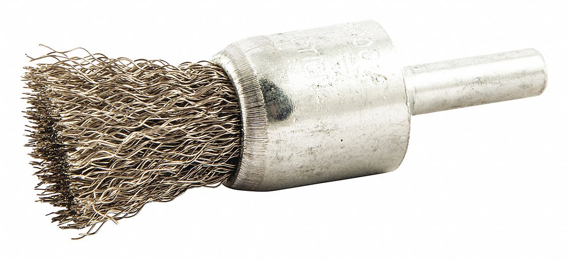 End Brush, End Brush, Bristle Type Crimped Wire, Brush Dia. 3/4 in, Abrasive Shank Size 1/4 in, Wire Dia. 0.008 in, Bristle Trim Length 7/8 in, Abrasive Material Stainless Steel, Max. RPM 22,000 RPM, Overall Length 2 1/4 in