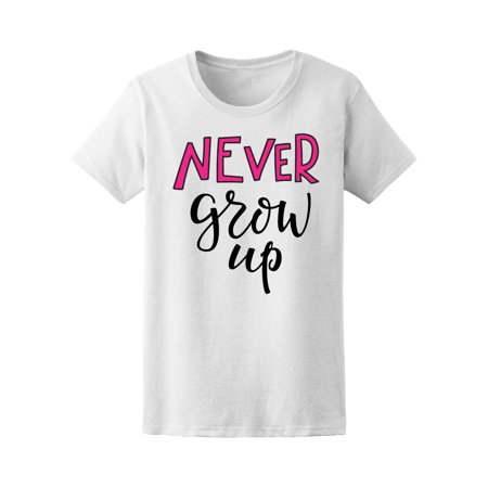 <ul> <li>Brand: Teeblox | Never grow up quote lettering. Calligraphy inspiration graphic design typography element. Cute simple vector sign.</li> <li>White | 100% COTTON | T-shirt | </li> <li>Perfect for this spring season </li> </ul>
