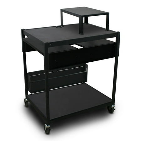 MVBAES2432-02 Features: -Vizion collection. -Full extension ball bearing slides. -Made in the USA. Product Type: -AV Carts. Commercial Use: -Yes. Country of Manufacture: -United States. Primary Material: -Metal. Shelves Included: -Yes. Casters Included: -Yes. Finish: -Black. Pull-Out Shelf: -Yes. Number of Shelves: -2. Dimensions: Overall Width - Side to Side: -32". Overall Depth - Front to Back: -24". Overall Product Weight: -86 lbs. Height Adjustable: -Yes. Overall Height - Top to Bottom: -46". Minimum Overall Height - Floor to Tabletop: -31". Maximum Overall Height - Floor to Tabletop: -39".
