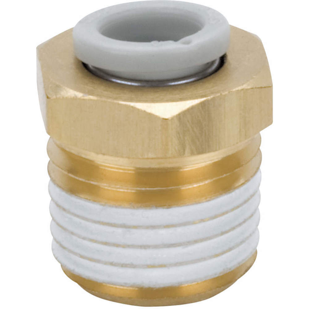 - Push-to-connect metric tube connection on one end and male BSPT threads with sealant on the other end